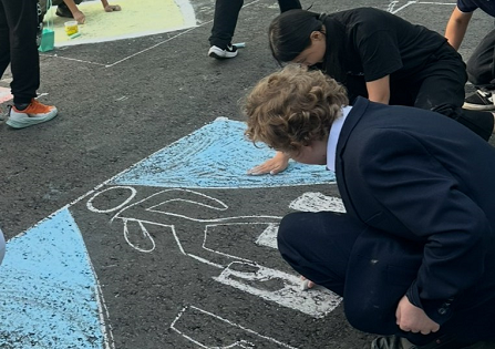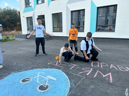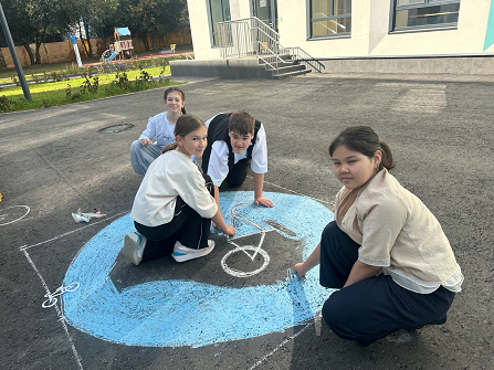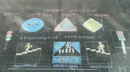 Ребята из 6 "Е" класса активно изучали правила дорожного движения прямо на школьном дворе. Они самостоятельно воспроизвели самые важные знаки ПДД, используя яркие мелки.